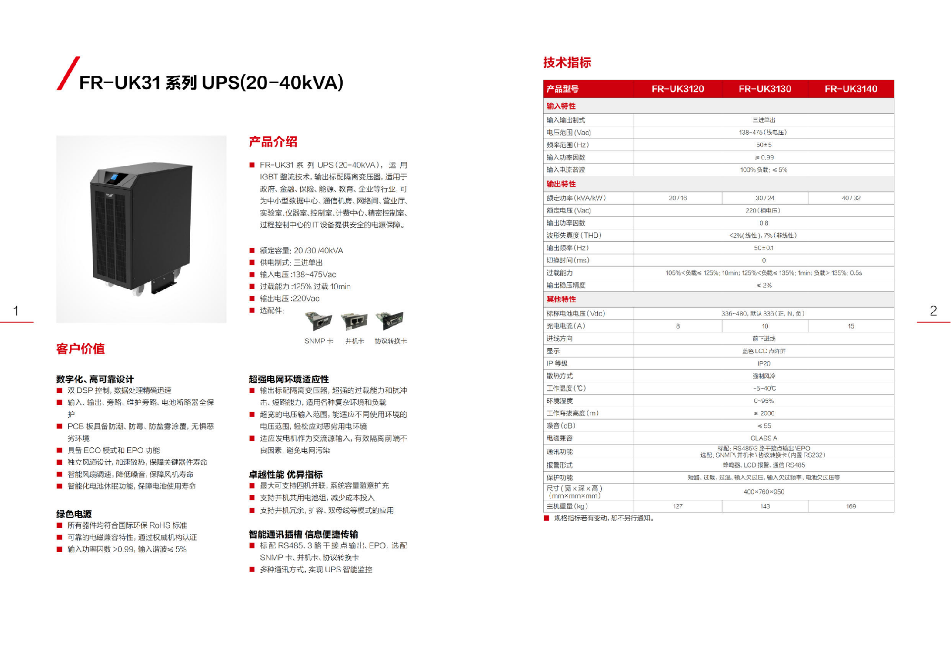 功能特點(diǎn)●數字化、高可靠設計雙DSP控制,數據處理精確迅速輸入、輸出、旁路、維護旁路、電池斷路器全保護PCB板具備防潮、防霉、防鹽霧涂覆,無(wú)懼惡劣環(huán)境具備ECO模式和EPO功能獨立風(fēng)道設計,加速散熱,保障關(guān)鍵器件壽命智能風(fēng)扇調速,降低噪音,保障風(fēng)機壽命智能化電池休眠功能